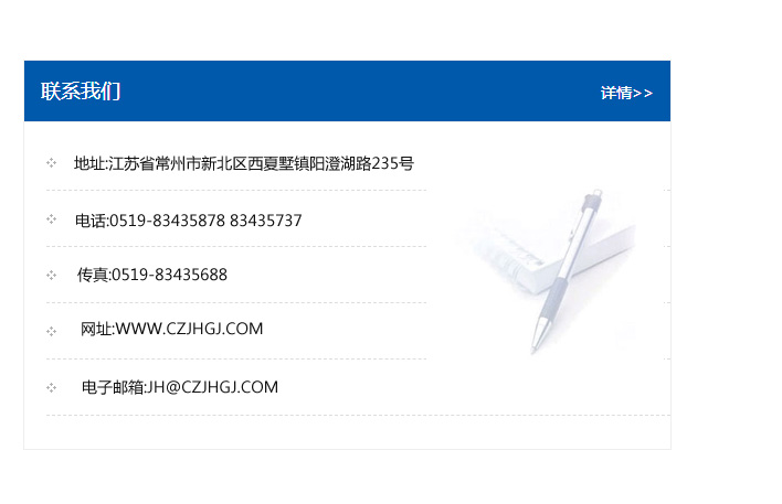 地址:常州市新北區友邦商務大廈1幢16、17層  電話:0519-85101652  傳真:0519-85112595  郵編:213022  網址:www.cz-jiayue_cn.tjkeyijia.com  郵箱:xiajifengaa@163.com